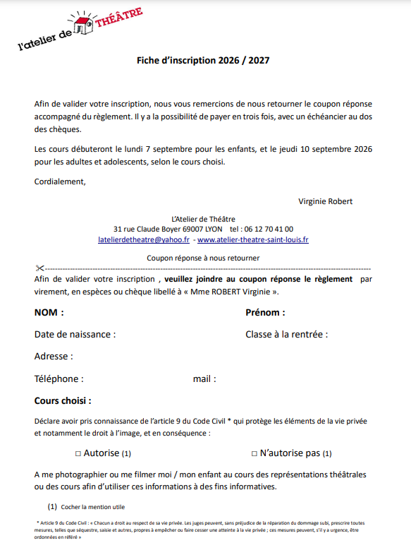par mail : latelierdetheatre@yahoo.fr